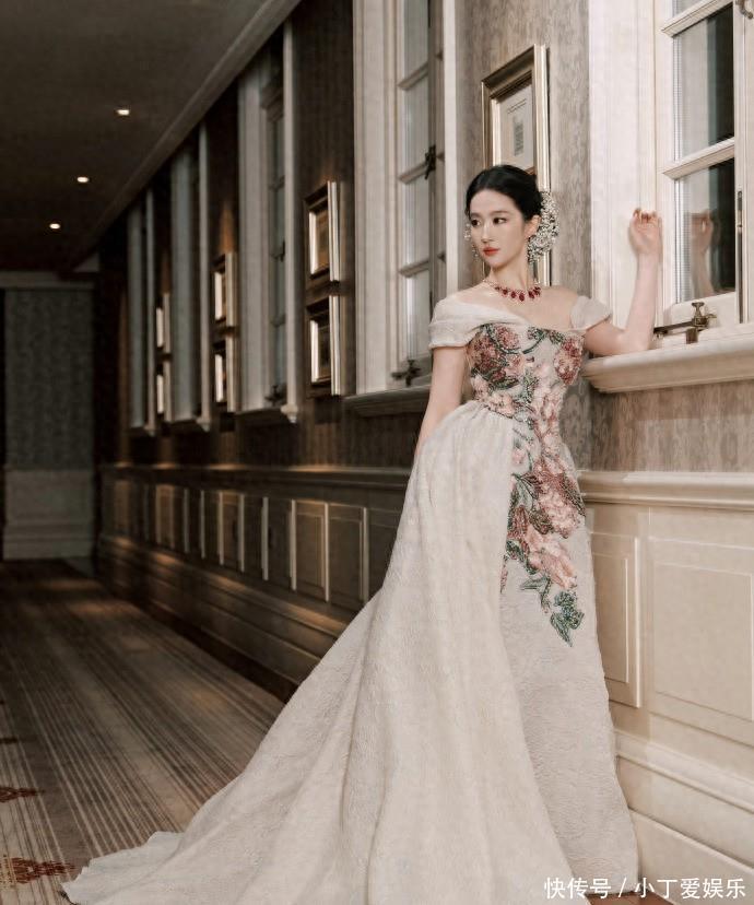 在细节上裙装采取露肩设计露出锁骨与花朵的柔美形成“刚柔并济”的对比。宽大而蓬松裙摆呈现出宫廷风的华贵气质整体剪裁凸显出她曼妙的身形。整体造型融合了古典与现代之美既端庄又不失灵动展现出极高的审美品位与独特的个人魅力。